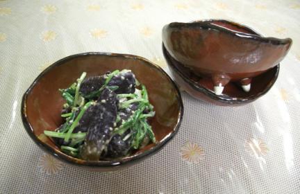 足つきの小鉢欲しかった。大きさも丁度ええ。お豆腐さんやおひたし、汁物にもイケル・・・ここに入ってるんは、なすびとみぶなのシーザードレッシング和え茹でて混ぜてゴマ振ってあるだけ。なすびのおひたしは和風になりがちやけど、こうするとサラダ感覚で美味しいんや