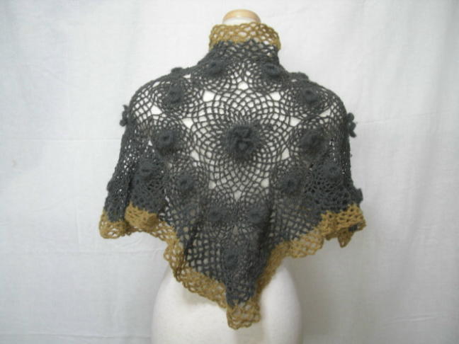 色は渋いけどフリルたっぷりで可愛いのが出来たんえ~。ネット編みの良い所は、自由自在に伸び縮みするとこ機械では編めないだけに一点物のレア感が一杯でありますシンプルなセーターやワンピースに合わせたら可愛いわよん。この作品は オークション に出してます。