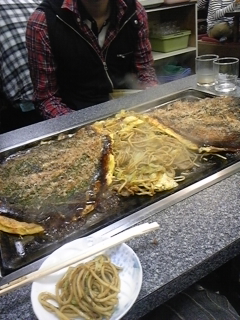 先日行った佐世保バーガーに続きデカ盛り”お好み焼きジャンボ”その名も如く、焼き上がりはチリトリみたいなので持って来ないとのらない程の大きさ焼きそばとお好み焼き2枚頼みました。鉄板からはみ出ていますよん。