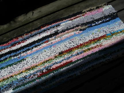 手ぬぐいを裂いてかぎばりで編んだら結構可愛いマットになりました。Tシャツを裂いて作るのはリサイクルでよくあるけど、伸縮の無い生地なのでよほどザックリ編まないとすべりが悪くて力が要ります。でも使い心地は厚みもそこそこあって快適