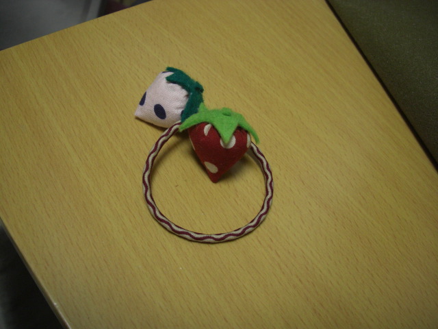 ヘアゴムイチゴ付きかわいっ!腕につけてもええしタオルやナプキンを留めてもええやんイチゴ部分はてぬぐい。直径約3cmの円すい