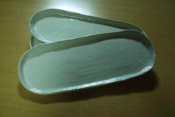 白い楕円のお皿。使いやすいやん**嬉手捻りの場合、同じ形をおソロで作るのは難しい。