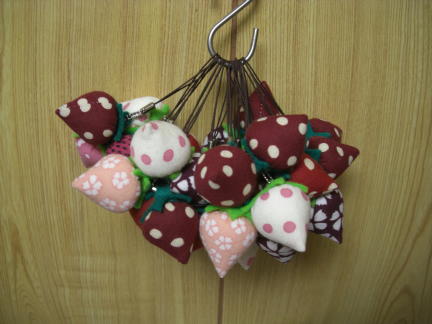 オークションにも出していた手ぬぐいで作ったイチゴてんてんから100個注文来ました。1個525円 嵐山店で売ってます。