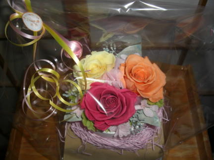 9月は私の誕生月。ま、40ん?才ともなると誰も祝ってもくれへんな~なんて思ってて、寂しいとかガッカリとか特別強調してた訳でもなく、自分が実際幾つになったんかも判らんようになってたくらいで・・・そしたら「遅くなったけど」とパパがお誕生日プレゼントくれたん 嬉しかったぁ~かわいいでしょー(結婚して18年。スタンド辞めた年、それまで毎年用意してくれていた大きな花束をやりたい仕事が起動に乗るまでもったいないしと断って以来初めてです。)このお花は生花なのに枯れない!★魔法のお花プリザーブドフラワー★大切に扱えば、3年以上綺麗な状態をキープ出来る不思議なお花です。