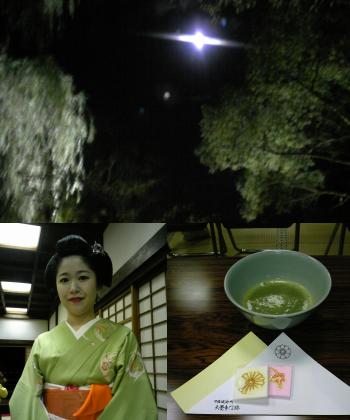 今年も行きましたよ。朝から雨模様でお月様は見えないんじゃないかと思っていましたが、雲の切れ間から覗いてくれました。今年は本物の舞妓さんがお抹茶運んでくれはりましたよかわいいでしょ。目の前に来はります。