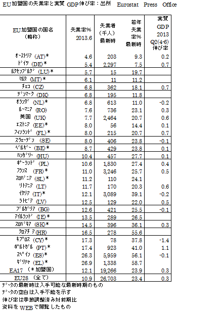 ユーロ圏17ヶ国の実質GDPの成長率は4-6月期に0.3%となり7四半期ぶりにプラス成長になり、ユーロ導入後最長の不況から抜けて景気が上向きつつある。独が0.7%(CF.日0.6%、米0.4%)と牽引役となり、仏も0.5%、さらにマイナス成長の伊、西班牙、和蘭などもマイナス幅は縮小、特にEUから財政支援を受けている葡萄牙は1.1%のプラスとなった。ECBの金融緩和の効果も出ていると思われ、徐々に弾みが付いてきたと見る向きがある。しかし、失業率はユーロ導入後で最悪の12.1%と高く(25才以下の若者失業率では23.9%と高く、特にギリシャの58.7%、西班牙の56.1%は飛び抜けている)、個人消費の急速な回復は期待できず、銀行経営状況から企業貸出も伸びていない。朝日新聞によると、英国調査会社IHSグローバルインサイトも、「緩やかな回復過程にあるが、通年(CF. Q1はマイナス0.3%、Q2は0.3%)では0.5%のマイナス成長に留まり、14年に0.7%増となる」見立てであると、いう。ギリシャの財政再建が旨く行かず、追加支援が必要で、再び欧州危機が再熱する可能性も燻っている。欧州の不況を受けて日本の輸出も悪化していたが、欧州が回復すれば日本の輸出も回復が期待され、通貨危機が回避されれば円安に向かう可能性もあり日本の輸出、通貨両面での環境がプラスとなる。他方で、欧州向けが全輸出の2割を占める中国は、不透明な「シャドー・バンキング」問題も抱えており先行きは不透明である。・・・・・以下には、欧州連合(EU)の資料を抜粋する。