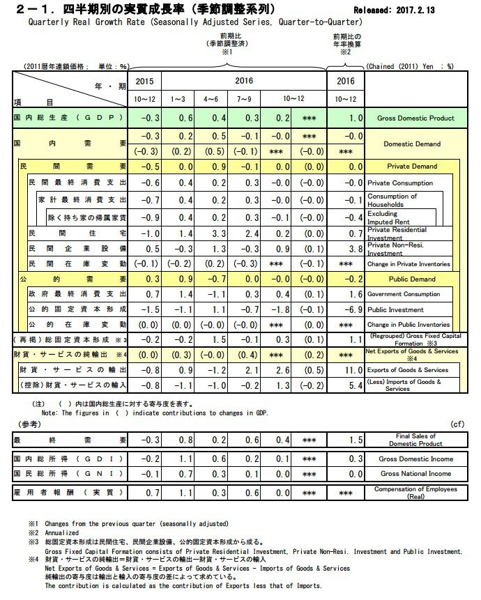 ★ 内閣府が発表したGDPの2016年度第3[四半期速報]QQE(Fiscal 2016 3rd Quarter Quick Estimation)では、「実質季節調整済みの年率=年換算額」でGDPは 524兆2,913億円となり、前期比 0.24%増加で、年換算率では 1.0%増加した。 この 0.24%の伸びは、国内需要ではなく、すべて外需が貢献している。項目別に見ると、1.GDPの56.7%を占める個人消費は 297兆48億円で、 前期比▲0.01%減少した。 飲食サービス、パソコン支出増の反面で、野菜、衣服が天候不順もあり押し下げた。 (全国スーパー売上が消費者のデフレ意識で減少しており、節約志向を反映して デスカウント店は伸びている。)2.住宅投資は 16兆1,079億円で、日銀のマイナス金利政策の効果で長期金利が低位 に有ることで、前期比0.2%増と4期続けているが、貸家建設の一服で 前期の2.4%より鈍化した。3.民間企業設備投資は、81兆2,012億円で、前期比 0.9%と2期ぶりに増加となり、 ソフトウェア、通信機器が貢献した。 (人手不足を補う合理化、省人化投資などの動きも。)4.政府最終消費支出は 106兆4,492億円と、前期比0.4%増加した。5.公的資本形成は 24兆7,834億円と前期比▲1.8%減となった。 第二次補正の効果は次の第4四半期に持ち越しとなった。6.輸出が 86兆2,967億円と前期比2.6%も伸びたのは、 自動車、半導体等電子部品などで、特に中国向けスマホ部品(高精細・省電力型) が好調であった。 (訪日外国人支出は1.9%増加した。)7.他方、輸入は 88兆7,240億円で、5期ぶりに前期比1.3%増加となった。8.純輸出(=輸出ー輸入)は ▲2兆3,273億円で、 前期の ▲3兆3,987億円から、1兆714億円改善した。9.GDPデフレーターは、前年同期比で ▲0.1%となり、 外国為替市場で円高に振れているために 物価の下押し効果となり、2期連続で前年を下回った。10.雇用者報酬は、「アベノミクスの企業家へのお願い」が功を奏したのか 名目で前年同期比2.0%増加した。 ///////////////////////////////////////////////////////////// 同時に発表された、2016年の「暦年実質GDP」とその推移は以下の通りである。 Calendar Year Real GDP 暦年 実質GDP 為替レート ドル換算後 2006年 496.6兆円 116.2993 4.27兆ドル・・・A 2007年 504.8兆円 117.7535 4.29兆ドル 2008年 499.3兆円 103.3595 4.83兆ドル 2009年 472.2兆円 93.5701 5.05兆ドル 2010年 492.0兆円 87.7799 5.60兆ドル 2011年 491.5兆円 79.8070 6.16兆ドル 2012年 498.8兆円 79.7905 6.25兆ドル 2013年 508.8兆円 97.5957 5.21兆ドル 2014年 510.5兆円 105.9448 4.82兆ドル 2015年 516.7兆円 121.0440 4.27兆ドル 2016年 521.8兆円 108.7929 4.80兆ドル・・・B B/A 105.1% 93.5% 112.4% <円高> 一応は、前年比1.0%増加と、5年連続のプラス成長を示した。 ★ 以上は、内閣府経済社会総合研究所国民経済計算、日本経済新聞、 日本経済のネタ帳(為替レート)などから 呆けの筆者が纏めたモノであり、 賢明なる諸兄は現物に当たられることをお薦めする次第である。 ・・・・・・・・・・・・・・・・・・ 今日は、冬季のテニス練習の予備運動(9:00~10:30;本来は~13:00)、 脳幹梗塞のトレーニングである太極拳(11:30~13:00)に 出掛けることにする。 その合間は、近くの大学構内のビュッフェでも立ち寄ろう? ”The University Dining” だが朝は軽食があるはずだ。 上記Reportは、前日の暇に任せてのとりまとめであるが、 呆けなりに疲れている。 次回から簡単に・・・★ 最後に、 Q.E.Team ?の迅速なGDP推計に感謝する次第! <Qeen Elizabeth Ⅲ:WIKIPEDIA>★