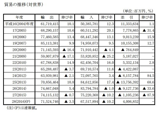 .日本の貿易は2008年のリーマンショックで輸出入が蹴躓き、 2011年の東日本大震災・原発事故で原子力エネルギー発電を失い 火力発電への依存から原油の輸入が急増した。 最近では幸いにして、原油価格の低位安定化に支えられて輸入が 減少している。 (中国の余剰鉄の輸出ドライブで鉄鋼の国際価格が低下したこともある。) 貿易収支は5期連続の赤字から2016年度には4兆円の黒字となった。 前年度比で見ると 輸出金額は ▲3.5%減少となったが、 数量指数では 2.4%の増加、 単価指数では ▲5.8%低下である。 輸入金額は ▲10.2%の減少であり、 数量指数では 0.5%の増加、 単価指数では ▲10.6%低下である。 貿易収支は 5.1兆円改善した。 (円高は2016年度には10.0% :120.39→108.41円/$) <貿易統計:財務省、以下同じ> ・「対米貿易」では、リーマンショックや東日本大震災にあっても 比較して安定して貿易黒字を保ち得てきた。・すこし、分け入ってみたい。 <上記2表は貿易統計から「めいてい君」が作成・・差し替え済み> ・日本の輸出を見ると、「全体」の約2割を「米国」が占め、次に「中国」が18%を占める。 前年から ▲3.5%減少しているなかで、「米国」が▲6.5%と大きく減少している。 日本の輸入は「その他国」(中東などの産油国)が 27.3%を占めており、同地域の 減少幅が▲13.7%と減少していることが大きい。 貿易収支は4兆円と前年から 5.1兆円改善されているが、 最も改善されているのは「その他地域」2.2兆円であり、「中国」は 1.8兆円、 「アジア(中国を除く)」 1.1兆円、EU 0.5兆円であり、 他方で、対米では▲0.6兆円と、むしろ悪化している。 しかし、今後については「その他地域」がOPEC減産などで原油の値上がりを 目指していることから予断を許さないこと、「米国」が貿易保護主義に走っており、 対米の貿易収支が悪化する可能性もあろう。 トランプ氏の保護貿易との妥協点では、シェールオイルなどを日本に輸出してもらい 「石油由来のエネルギー確保先国」を 「中東依存」から分散させることではないだろうか?★ <参考> 品目別には財務省が主要品目を提示しているので下記に転記する。 アジアの内数 ★