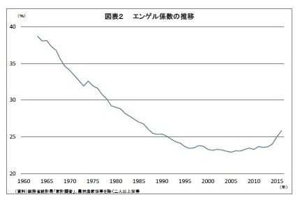 ★ 生物は食物・栄養を摂取しないと生きられない。 人間においても、聖人か俗物かを問わずこの法則は変わらない。 だから、人間の合理的な消費活動においても、 食費への支出割合が高いほど生活水準が生存面で厳しいことを示していると言える。 生きるが大事・・・余暇などに支出する余裕がないのであろう。★ ニッセイ基礎研究所が長期のエンゲル係数を示してくれている。 <エンゲル係数長期推移:ニッセイ基礎研究所> 国民が豊かになって来ているから、エンゲル係数は長期的に低下してきた。 ところが、1995年ころから底打ち状態となり、ここ最近は上昇気味である。 最近のエンゲル係数の推移をGarbagenewsで見てみたい。 ここ3年くらいは2%ほどエンゲル係数は上昇しており、 エンゲル係数自体は、概して、高齢者ほど高いのだが、勤労者の30歳未満層では ここ最近急速な上昇を見ていることに注意すべきかも知れない。 <エンゲル係数の推移:Garbagenews> <家計調査:内閣府以下おなじ> 小生のような年金生活者は、年金収入も減らされ、介護保険料なども 増嵩しているから、自然とエンゲル係数は高まる。 若者も、給与の伸び悩み、社会保険料の増大などで、困窮度が高まって いるかもしれない。 <夫のみ有業世帯> <共働き世帯> 家計調査によれば、共働き世帯がエンゲル係数23.1%に対して、 夫のみ有業世帯は24.2%と高くなっており後者にはゆとりが少なそうである。///////////////////////////////////////////////////// 共働き世帯だと、外食のウエートが増え、食費は増えるが、所得も増えるので エンゲル係数は共働き世帯が低いのだろうか。 それとも、食費以外の費用が多いために、共働きを余儀なくされるのだろうか。 政府が狙う?円安政策で、自給率の低い我が国の、食料品輸入価格が上昇、 さらには、世界的な食料争奪戦で食料品価格が上昇しつつある。 ///////////////////////////////////////////////////★ このような、エンゲル係数が示すような「ゆとりのなくなった状態」で、 いままで低位にあった原油価格などのエネルギーが上昇しようとしている。 政府は物価上昇の目標2%のみを見つめているが、 賢い消費者が恒常所得の儚い夢を見て、つまり、 物価上昇による「実質手取り収入」の減少を予見して、 節倹・貯蓄に向かい、 消費活動にブレーキを掛けるのは経済合理的な行動であろう。 マイナス金利政策は、将来の期待をマイナスに感じる傾向もあり、 また、エネルギー価格の上昇(原油価格値上げや円安)が 食料の生産・収穫・包装・梱包資材・運送などの費用増嵩をもたらし、 今後日本経済に大きく影響する懸念を呆け頭は感じる。★ 呆け頭の杞憂でなければいいのだが・・・★