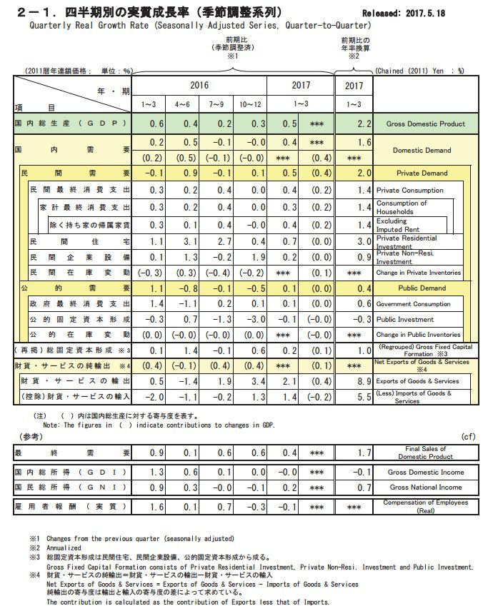 ★ 「号外」差替え記事1. 内閣府が2016年度第4四半期GDPを本日公表 価格の変動を除去した実質ベースの季節調整済み前期比伸び率で見てみる。 <内閣府経済社会総合研究所国民経済計算から> 1. 実質(=2011暦年連鎖価格)GDP成長率は 0.5%(年率換算=2.2%)となった。 内需の寄与度は 0.4%、外需寄与度は 0.1%となり、7~9期、10~12月期が外需依存 が高かったのに比べて異なる動きである。 <実額では年率(以下同じ) 526.8兆円である。> ・・・以下は構成項目の分析・・・ 2. 民間消費支出の成長率は 0.4%で、前期の横ばいから僅かに増加した。 <実額では 298.1兆円であり、GDPの 56.6%を占める。> 3. 民間住宅投資は、0.7%と、4~6月期の3.1%、7~9期の2.7%には及ばないが、 10~12期の0.4%より伸びた。 <実額では 16.3兆円であり、GDPの3.1%を占める。> 4. 民間企業設備投資は、僅かに0.2%の増加で、前期の 1.9%に比べても弱い。 <実額では 82.2兆円と、GDPの 15.6%を占める。> /////////////////////////////////////// 機械受注統計が発表されているが、 2017年1~3月は▲1.4%、4~6月見通しは▲5.9% と停滞感が強まっている、のが気がかりである ////////////////////////////////////// 5. 民間在庫変動は 0.1%の増加。 <実額では0.4兆円。> 6. 政府最終支出は 0.1%の増加。 <実額で 106.3兆円でGDPの 20.2%を占める。> 7. 公的資本形成は7~9月の▲1.3%、10~12期の▲3.0%から▲0.1%とほぼ横ばい。 <実額では 24.4兆円で 4.6%を占める。> 8. 公的在庫変動は▲0.0% <実額ではほぼゼロ> 9. 輸出は 2.1%の増加で、前期の 3.4%より鈍化 <実額では 88.5兆円でGDPの 16.8%を占める>10. マイナス項目の輸入は 1.4%の増加で前期の 1.3%から横ばい <実額で[マイナス] 89.9兆円で ▲16.8%を占める>11. 9~10の差し引きである純輸出は、赤字が▲32.1%減となった。 <実額で▲1.4兆円で、GDPの▲0.3%を占める。 純輸出の赤字は2011年4~6期以来続いている。>12. デフレーターは▲0.6%(前期は 0.1%)となり、 内訳は国内需要デフレーターは▲0.0%(同 0.4%)、 輸出デフレーターは2.8%(同 2.3%)、 輸入デフレーターは6.5%(同 4.4%)2. 2016年度GDPとしては実質ベース速報値となる公表 1. 2016年度(2016.4月~2017.3月)の実質GDPは 523.5兆円となり 前年度から 1.3%増加。 2. 民間最終消費支出は、 297.0兆円と GDPの56.6%を占め、 前年度から 0.6%増加。 3. 民間住宅投資は、 16.1兆円と、GDPの 3.2%を占め、 前年度から 6.5%の増加。 4. 民間企業設備投資は、81.4兆円と、GDPの 15.5%を占め、 前年度から 2.3%の増加と、前年度の伸び 0.6%より少し高い。 5. 民間在庫変動は 0.9兆円であった。 6. 政府最終消費支出は、106.0兆円で、GDPの 20.2%を占め、 前年度から 0.6%増加し、前年度の伸び 2.1%より少し低い。 7. 公的資本形成は 24.8兆円とGDPの 4.7%を占め、 3年度続いてマイナスの伸びであり、2016年度は▲3.2%と最も大きい。 8. 輸出は 85.3兆円とGDPの 16.3%を占め、 前年度から 3.1%増加。 9. マイナス項目の輸入は ▲88.5兆円と、GDPの▲16.9%を占め、 前年度から▲1.4%の減少となった。10. 純輸出(8.-9.)は ▲3.2兆円と、2011年度からのマイナスが続いているが、 前年度からマイナス幅を縮小した。★ 新聞報道では実数を抜きにしているから、非常にわかりにくいのであろう。 判りにくいことを明確にするのが報道機関の役目であるはずなのだが・・・ 呆け頭には、実数がないと、「この世」の動きは理解できない。 呆け頭のまとめであるから、信用できないであろう。 ぜひ、下記を検証してください。 http://www.esri.cao.go.jp/jp/sna/data/data_list/sokuhou/files/ 2017/qe171/pdf/gaiyou1711.pdf http://www.esri.cao.go.jp/jp/sna/data/data_list/sokuhou/files/ 2017/qe171/pdf/jikei_1.pdf http://www.esri.cao.go.jp/jp/sna/data/data_list/sokuhou/files/ 2017/qe171/pdf/jikei_2.pdf ・・・以上は、「内閣府経済社会総合研究所国民経済計算」の資料から・・・ 国民経済計算部の方々には、たいへんご苦労様です!★
