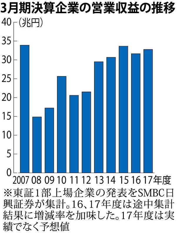 ★ SMBC日興證券の東証一部800社)の2017/3期決算について、 5月11日までの公表分(金融機関を除く)が集計されている。 史上最高という収益を見ていこう。 ここからは、めいてい君の間違いが入っている可能性があるが、 ご勘弁を願いたい。 東証一部のなかの金融機関を除く800社であるので 日本の全産業の比較的良好な会社の動きである。 代表的な企業をいくつかの業界に纏めて集計してみる。 全体としては23%の増益となっている。 (上記の800社では18%の増益であり、下記のサンプルは さらにより好景気の企業を見ていることになる) 営業利益ベースでは、減益が、自動車、繊維、造船重機、 増益が、商社、ゼネコン、不動産、電機である。 最終利益をみると、自動車業界だけ減益であるが、その他は増益となっている。 代表的な産業毎に、主要企業を見てみたい。 (日経会社情報DIGITALによる。) 1.自動車業界 営業利益ベースでは、ホンダ、スズキは増益、その他は減益、 全体としては▲17%の減益である。 最終利益は▲12.5%の減益、ホンダ、日産、スズキは増益、 トヨタは減益、三菱自は大幅赤字 2.電機業界 営業利益ベースでは、パナソニック、富士通、シャープ(前期赤字) は増益、その他は減益である。 全体では約10%の増益である。 最終利益は21.8%増加、日立、富士通以外は減益、 シャープは赤字だが赤字幅は▲2,560→▲248億円に縮小。 3.ゼネコン業界 営業利益ベースでは全般に増益である。 最終利益も43%の増加 4.製紙業界 営業利益ベースでは、王子製紙、大王製紙は減益、 日本製紙、北越紀州製紙、三菱製紙は増益、全体は横ばいである。 最終利益は63.4%増加、大王、三菱は減益 5.繊維業界 営業利益ベースでは、東レ、帝人が減益、ユニチカが増益、 全体では▲6%の減益である。 最終利益は20.3%増加、東洋紡は減益 6.民放業界 営業利益ベースでは、TBS,テレビ朝日は増益、フジ、テレビ東京は 減益で全体はほぼ横ばいである。 最終利益は14.8%増加、TV東京は減益 7.不動産業界 営業利益ベースでは、野村不動産以外は増益であり、 全体は増益。 最終利益は全体として14.2%増加だが、野村不動産は横ばい 8.造船重機 営業利益ベースでは、IHIのみが増益、 その他は住友重機が▲4%の減益、以外は大幅な減益で、 全体としても大幅な減益。 最終利益は8.4%増加、川崎重工が大幅減益、住友重機が横ばい、 その他は改善。 9.商社 経常利益ベースでは、3.3倍と大幅な利益改善が見られる。 特に前期不振の三菱商事(前期▲928億円)、 三井物産(243億円)、丸紅(906億円)の収益改善は目覚ましい。 最終利益は11.4倍の増加。特に、前期不振であった 三菱商事(前期▲1,494)、三井物産(▲834)、 豊田通商(▲437)は大幅な黒字転換を果たし、 丸紅(623)、住友商事(745)も大幅に改善している。 ★