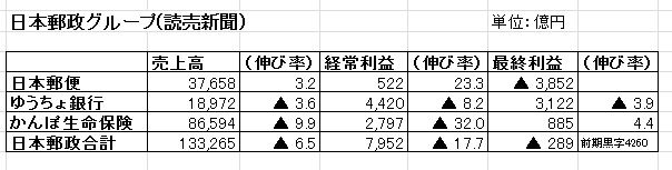 ★ 以下は、日本経済新聞「会社状況:業績・財務」、読売新聞から数字を拾い、 合計は小生が計算したものを主にしている。 めいてい君のことだから信用しないで、ご自分で確認されることが必要かも。★1.日本郵政グループ <売上高=経常収益> ・日本郵政・・郵便物の減少、人件費高騰。豪州トール・ホールディングス(物流)の買収後 同社の経営不振で4,003億円の特別損失計上 <今後野村不動産を買収し、保有不動産開発を収益の柱とする戦略がある> ・ゆうちょ銀行・・国債の運用収益が低金利で落ち込んだ ・かんぽ生命保険・・保険契約数の減少2.大手銀行グループ ・日銀が昨年2月導入したマイナス金利政策で貸出金利の低下で収益が悪化。 東芝向け融資の貸倒引当金が膨らんだ ・各社は新しい収益源に個人向け無担保カードローンをここ数年伸ばしてきたが 過剰融資の批判から今後の伸びは期待しがたい。 ・三井住友は前期に消費者金融で多額の損失を計上している。3.地銀大手グループ ・日銀のマイナス金利政策で、貸出金利低下、投資信託・保険の販売の減少 ・トランプ政権の発足で、米国長期金利が上昇し米国債の価格が下がったために 地銀が保有する米国債の価格が低下したための評価損計上 ・個人無担保カードローン、アパートローン(賃貸住宅建設者への貸付)などに 活路を求めてきたことの後始末が今後の伸びを抑制か4.石油元売り ・6社とも黒字転換・・環境=16年11月以降のOPEC減産の合意で原油価格持ち直し ・JXTGHDについてはJXHDが今年4月東燃ゼネラル石油と経営統合 ・出光は上場後の最終尻が最高益5.石油化学工業 ・円高で海外からの収入が目減り ・三菱ケミカルホールディング・・食品包装用フイルム販売など好調 ・住友化学・・千葉工場一部停止で出荷減少 ・三井化学・・化学品原料生産設備の稼働率向上で過去最高益 ・旭化成・・最終尻の増加は、保有有価証券の売却による6.製薬大手 ・6社が減収・・・環境=円高による海外売上高の円換算の減少 ・武田薬品工業・・潰瘍性大腸炎治療薬の販売好調で大幅増益 ・アステラス製薬・・主力の前立腺がん治療薬の堅調で2期連続の過去最高益 ・第一三共・・主力の高血圧症治療薬の特許切れによる収益減7.携帯大手 ・国民がスマートフォンで動画を見る習慣が浸透 ・さらに、総務省が業界の過剰な値引き競争を抑制したなどで業績が好転 ・各社とも光回線+スマートフォンのセット割引が好調 ・KDDIはデータ通信大容量プラン加入者の増加8.JRグループ ・東日本、東海、西日本、九州、貨物の5社の最終利益は過去最高 ・訪日来客数の増加で東日本は2期連続、東海は5期連続の新幹線利用客増加の運輸収入増 ・西日本は7期ぶりの減収だが、法人税減税効果で5期連続の最終利益の増加 ・九州は熊本地震で運輸収入減があったが、マンション販売が好調 ・貨物は熊本地震で運賃収入が2期ぶりに減収となったが、燃料費が下がり増益 ・北海道は新幹線開業で運賃収入増加したが、台風による減収、修繕費の膨大で 最終利益は鉄道赤字補填の「経営安定資金」運用益減少で過去最悪の赤字 ・四国は経常利益は6期ぶりに赤字となり、「経営安定化資金」で最終利益の赤字 は免れた。9. 損保大手3社(読売新聞などから) ・台風等の自然災害の保険金支払いが減ったこと、自動車事故発生の減少などで 最終利益は過去最高。 ・東京海上、MA&ADはともに海外子会社の収益を計上し、売上高も過去最高。 ・主力の自動車保険支払いは、安全技術(自動ブレーキなど)の進歩によるものが大きい。★
