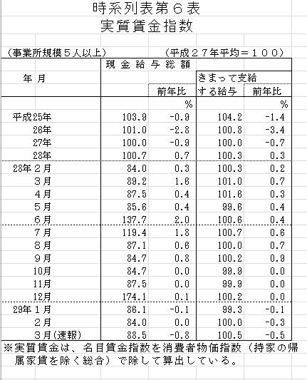 ★ 5月9日というと皇居で鈴村 興太郎博士の瑞宝重光章の伝達式があった日である。 我が国でのお目出度い式も彼の理論の素晴らしさを証明するモノであるが、アマルティア・セン博士のノーベル経済学賞があればもっと良いと思う次第である。 もっとも、呆け頭には理解できない理論なのだが・・・★ さて、厚生労働省からこの日に公表された毎月勤労統計調査の2017年3月分を見るとしよう。 <実質賃金指数=現金給与総額指数/消費者物価指数> 「実質賃金指数」は対前年同期比で▲0.8%の減少した。 「消費者物価指数」の対前年同期比は 0.3%上昇しており、「名目賃金指数」も▲0.4%減少している。 毎月勤労統計では細かく分類されているが、ここでは、サンプルの内で製造業以外を非製造業とみなして小生が計算する(実際の産業構造とは異なるのであくまで参考としてみて貰いたい)。 <厚生労働省毎勤統計から計算> 「雇用数」はサンプル全体でみて2.4%増加であった。 全体の16.3%を占める製造業では0.3%の増加に止まり、特に2.2%を占めるパートタイムの製造業では▲6.0%の雇用減少がみられた。 全体の大半を占める非製造業では一般労働者が2.9%増加、パートタイマーも2.5%増加した。 「名目賃金」は、一般労働者では▲0.5%程度の減少であったが、パートタイマーについては、全体として▲1.9%の減少であるが、そのなかでも製造業の▲1.2%より、非製造業が▲1.8%と減少幅が大きかった。 名目賃金の減少は、労働時間の短縮(とくに所定外時間の減少)によるものであり、総労働時間は前年同期比で▲1.9%減(所定内▲2.0%、所定外▲0.3%)、一般労働者では同様に▲1.7%減(所定内▲1.9%減)、パートタイマーでは▲3.5%減(所定内▲3.4%減)と「1人当たりの仕事量が減少」した。 ワークシェアリングで雇用者数は増えたようであるが、労働者の賃金率は低下しており、実質的にも物価上昇で1人当たり賃金率は下降しているのではあるまいか??? 国家の金融の要である、日銀が物価上昇を目標にするのは福祉厚生的な視点から間違っているのではありませんか? もっとも、日銀はその役割を背負っていないモノなので、期待してはいけないかも。★ 以上は、呆け頭の勘違いかも知れない。 なぜなら、新聞報道(物価視点=日銀?)と趣が異なるからである。 新聞報道には Fake News はないモノと思うが・・・ 多分、視点のフォーカスが大新聞記者と小生の目(呆け)とで違っているのであろう。★ 呆けの独り言である。★ 補足すると、パートタイマーの給与水準は、一般労働者を100とすると、パートタイマーは、産業計で27、製造業で32、非製造業で26である。 パートタイマーのなかでも製造業が非製造業に比べて給与は2割ほど高い。 同一労働の比較ではないが、一般労働者、パートタイマーの賃金格差はおおきく、パートタイマーでは、非製造業就業者数は伸びているが、製造業就業者数は減少さえ見られる。★