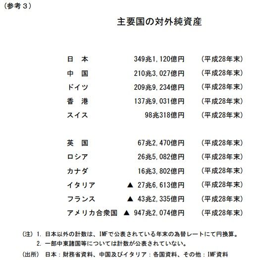 ・本邦対外資産・負債・純資産の2017.3.31現在の残高と年度増減額 (単位:兆円)項目資産増減(内為替因)負債増減(内為替因) 直接 投資 159.2 7.3 ▲5.0 27.8 3.1 - 証券 投資 452.9 29.6 ▲14.0 324.5 3.9 ▲0.6 (株式・ 投資ファンド 持分) 162.9 9.3 ▲4.4 181.5 ▲5.4 - (債券) 290.0 20.3 ▲9.7 142.9 9.3 ▲0.6 金融 派生 商品 43.4 ▲1.7 - 45.4 ▲0.3 - その他 投資 199.8 18.6 ▲3.1 251.0 31.3 ▲4.3 外貨 準備 142.6 ▲6.0 ▲5.0 合計 997.8 47.9 ▲27.2 648.7 38.0 ▲4.9 純資産 349.1 9.9 ▲22.31. 対外純資産は 349.1兆円で、26年連続で世界最大の大きさを保っている。2. 対外資産は 997.8兆円で、過去最大となり、国内企業の海外企業M&Aの活発、 国内低金利の中で海外の株式・債券投資を増やしたことなどによる。3. 他方で対外負債は、648.7兆円で、外人投資家の債券投資が増えた。4. 米国に関しては2016年末と2015年末を比較すると、 工場などの海外直接投資残高が 53.2兆円(5.4%増加)で、 他方、日本への直接投資残高は 7.0兆円(2.5%増加)であり、 差し引きの対米純直接投資残高は 46.2兆円となった。 ドル円為替相場 120.42円→117.11円 (ドルは円に対して▲2.7%低下)5. 補足的に2016年度の国際収支を見ると、 経常収支は 20兆1990億円 (前年度 17兆8618億円;リーマンショック前の2007年度24兆3376億円以来) 貿易収支 5兆7654億円 (前年度3296億円から大幅黒字、原油安でLNGや原粗油 の輸入額が減少) サービス収支 ▲1兆5058億円 (前年度▲1兆3527億円;旅行収支は過去最高を示したが、 円高で知的財産権使用料などの受け取りの減少が大きかった) 第一次所得収支 18兆356億円 (前年度20兆8964億円;円高で証券投資の配当金受け取りの減少) 第二次所得収支 ▲2兆962億円 (前年度▲2兆114億円とほぼかわらず) ★ ・主要国の対外純資産比較 <昨年末の主要国の対外純資産の比較 財務省> 1. 日本の対外純資産が大きいには、日本の裕福なこと、日本企業が海外投資を 活発化させる反面、海外企業からは日本での企業活動に魅力がないことかも 知れない。 2.他方で、米国では、国内への外国投資が大きく、対外純負債が世界最大 であるのは、海外から工場進出などに魅力のある市場とみられている ためである。 3.日本が対外純資産世界一であることは、円の強さを示している。 日本経済は、国内に天変地異が生じても、海外資産を引き上げて対応する 余裕があるとみられるから、「円は安全な資産」として扱われる。 4.ただし、エネルギーは輸入に依存しているから、 原油価格がいったん上昇し始めると厳しい経済環境となる弱みがある。 5.その他 ★
