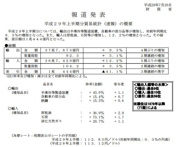 ★ 財務省から上半期の貿易統計が発表された。・対全世界・・・貿易額は 74.5兆円、10.9%増加、 貿易収支は 1.0兆円 対全世界への輸出は金額 37.8兆円で対前年同期比伸び率は +9.5%, これを数量伸びでは +5.1%、残渣伸び(=価格)では +4.4%となる。 対全世界からの輸入は金額で 36.7兆円、対前年同期比伸び率では +12.2%、 数量伸びでは +3.5%、残渣伸び(=価格)では +8.7%である。 数量的には輸出の伸びが輸入より +1.6%伸びているが、 価格面では輸入が輸出より +4.3%も伸びているのが気にかかる。 輸出の増加を主要品目で見ると半導体などの製造設備、自動車部分品、鉄鋼が 寄与しており、 他方の輸入の増加を主要品目でみると、原粗油、石炭、LNGが寄与している。/// <2017年上半期貿易統計:対全世界;財務省から>///・対米国・・・貿易額は 11.3兆円(シェア 15%)、貿易収支 3.2兆円 対世界貿易の 15%を占める対米貿易は、輸入の伸びが輸出に比べて大きく、 貿易収支は2期連続で減少した。 ・対EU・・・貿易額 8.4兆円(貿易シェア 11%)、貿易収支 343億円 対世界貿易の 11%を占める対EU貿易は、輸出入がほぼ等しく、 貿易収支は10期ぶりに僅かながら黒字となった。 ・対アジア・・・貿易額 38.3兆円(シェア 51%)、貿易収支 2.7兆円 対世界貿易の過半を占める対アジア貿易は、輸出の伸びが上回り、 貿易収支は3期連続で増加した。 対世界貿易の21%を占める中国貿易では、輸出の伸びが上回ったものの、 絶対額では輸入額がなお大きく、 貿易収支は▲1.9兆円の赤字で、57期連続の赤字であった。 ・対世界貿易額などの推移(単位:兆円) 日本の貿易統計は「貿易収支」という差額概念が強すぎないであろうか。 「貿易額」も入れてみた。期間貿易額輸出前年同期比%輸入前年同期比%貿易収支 2011年 133.6 65.5 68.1 -2.6 上半期 65.2 32.1 -3.0% 33.1 +11.1% -1.0 下半期 68.4 33.4 -2.5 35.0 +13.1 -1.6 2012年 134.4 63.7 70.7 -7.0 上半期 68.1 32.6 +1.5 35.5 +7.4 -2.9 下半期 66.3 31.1 -6.9 35.2 +0.4 -4.0 2013年 151.0 69.8 81.2 -11.4 上半期 72.8 34.0 +4.1 38.8 +9.1 -4.8 下半期 78.2 35.8 +15.0 42.4 +20.8 -6.7 2014年 159.0 73.1 85.9 -12.8 上半期 77.8 35.1 +3.2 42.7 +10.1 -7.6 下半期 81.2 38.0 +6.2 43.2 +1.8 -5.2 2015年 154.0 75.6 78.4 -2.8 上半期 77.3 37.8 +7.9 39.5 +7.4 -1.7 下半期 76.7 37.8 -0.6 38.9 -10.0 -1.1 2016年 136.0 70.0 66.0 +4.0 上半期 67.2 34.5 -8.7 32.7 -17.1 +1.8 下半期 68.8 35.5 -6.1 33.3 -14.4 +2.2 2017年 上半期 74.5 37.8 +9.5 36.7 +12.2 +1.0 下半期 ★・貿易統計の説明資料の中に気になる数字があった。 「伸び率」であり、「金額」、「数量」、「価格」についてである。 呆けの小生には、 1. 世界的に輸入価格が上昇していること。 2. 輸入価格の上昇が輸出価格の上昇より倍のスピードで上昇中である。 3. その中で、対米、対EUの輸出入価格がほぼ横ばいである。 先進国間は価格がデフレ気味なのだろうか。 4. 輸入価格では対米、対EU、対中国のほぼ横ばいも気にかかる。 つまり、相対的に中国のダンピングがあるかもしれない、ということである。★ 呆け頭の間違いかも・・・★