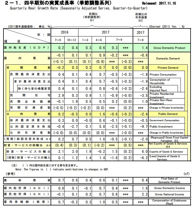 ★ 既に、発表済みではあるが、 腰痛で詳しく見られなかったので 記録しておきたい。 判断は貴兄の鋭い感覚のみが頼りである。(呆けの小生は、GDP成長率が外需に引っ張られており、 他方で、輸入物価の上昇圧力が強まっていることが 気懸りである。 国民は、将来の不安もあり個人消費が伸び悩むのではなかろうか?)★ 2017(平成29)年7~9月期四半期別GDP速報 (1次速報値) Quarterly Estimates of GDP for July - September 2017 (First Preliminary Estimates) 平 成 29 年 11 月 15 日 内閣府経済社会総合研究所 国民経済計算部 四半期速報(=QE)総括表★ 需要項目別★ 年度・暦年GDP速報★ 年度速報★