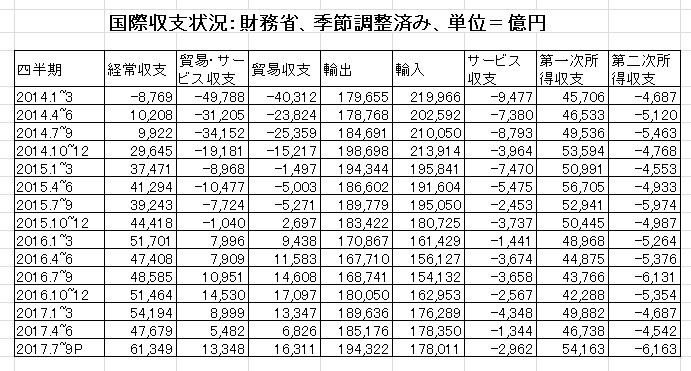 ★財務省から本邦経常収支の2017年9月度(1次速報)が発表された。1. 四半期ベースの「季節調整済み系列」を並べる。2. 「原系列の月次を上期・下期」に括ってみる。3・原系列の上期・下期を(対前年同期比で)見ていこう。 国際収支を表す、「経常収支」の2017年度(FY)上期は原系列で見て、 11兆5,337億円で前年同期比で11.7%増加した。 上半期として見ると 2007年度上半期12.48兆円以来の高水準である。 <今上半期の分析> 輸出が、自動車・半導体の好調で、37.56兆円と前年同期比で12.9%増加し、 他方で、原油価格などの値上がりから、輸入が34.87兆円と15.1%増加 したため、貿易収支は2.68兆円と黒字幅は2,749億円の圧縮となった。 サービス収支の赤字幅は、韓国・中国などの訪日外国人の増加で、2,582億円 縮小した。 本邦経常収支の最大の黒字をもたらす第一次所得収支(日本企業の投資した 外国子会社からの配当金、債券収入)は10.38兆円で、 経常収支の90%を占めた。 第二次所得収支は、▲9,589億円と、赤字幅が798億円縮小した。★ 2017年9月度単独の経常収支は、2.27兆円で39ヶ月連続の黒字であった。★ 地域別の経常収支 原系列1年分の累積 (2016年7月~2017年6月)トータル 20兆3,938億円アジア 10兆0,727億円(中国) ▲8,559億円(香港) 5兆1,597億円(台湾) 2兆1,038億円(韓国) 2兆5,882億円(シンガ) 1兆5,668億円(その他) ▲4,899億円北米 12兆6,990億円(米国) 12兆5,131億円中南米 1兆5,665億円(メキシコ) 6,798億円(ブラジル) ▲3,782億円(ケイマン) 2兆0,981億円大洋州 ▲9,646億円欧州 2兆4,984億円中東 ▲ 5兆5,837億円(サウジ) ▲ 2兆3,484億円(UAE) ▲ 1兆5,398億円(イラン) ▲ 3,351億円 アフリカ ▲ 270億円★参考:1. 中国の対米貿易収支 2016年 2,506億ドルの黒字 2017.1~10月 2,230億ドル=3,467-1,237 ↓ トランプ大統領の中国訪問で中国側の投資・商談申し出 2,500億ドル(約28兆円) 航空機=370億ドル 半導体= 40億ドル 自動車= 95億ドル2. 中朝貿易 貿易総額 3.7%増加 中国→北朝鮮 25.4845億ドル(2017.1~9月)前年比2割増加 (食糧輸出は激増) 原油パイプライン輸出は貿易数字から除外?★呆けのメモに過ぎません。★
