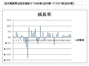 ★ :::前置き::: 昨日は、美味しい大粒の干し柿が 「レターパック」で3粒届いた。 自由が丘氏に、図々しく「食べたいよ!」と おねだりしたのが聞き入れてくれたのであった。 聞くところでは、ブログを見た知人からメールで大勢 「送ってくれ!」との要望があった、という。 56個の干し柿なので、自分用は残ったのか判らない。 以前お話しした、彼の将来の旅行予定先:エディンバラ (英語: Edinburgh [ˈɛdɪnbərə]) の ご夫妻にも送ったのであろうか? 生柿(Fresh Persimmon)は送れないが、 干し柿(Dried Persimmon)なら、 ”Dried Persimmon”と表記してEMS*でおくられたかも? (*EMS=Express Mail Service) 甘味を閉じ込めたような吊るし柿は 自由が丘氏の真心が籠っていた。 有り難う、自由が丘氏! さて、本題である。(今日も腰痛で、地域スポーツ振興テニスは欠席である。)★ <成長率は季節調整済み年率換算系列です> 「内閣府」から発表されたFY2017第2四半期実質GDPの 季節調整済み四半期2次速報値では 年率換算2.5%(四半期率0.6%)→3.2%(同0.8%)に 改訂された。 主要項目を四半期率で伸び率・寄与度(括弧書き)をみる。 <減少した項目>は 民間最終消費支出▲0.4%(▲0.3%)→▲0.3%(▲0.3%) 民間住宅▲0.2%(▲0.0%)→▲0.3%(▲0.0%) 公的固定資本形成▲1.8%(▲0.1%)→▲2.0%(▲0.1%) <横這い項目>は、 公的在庫変動 (▲0.0%) 政府最終消費支出0.2%(0.0%) 財貨サービス純輸出 (0.6%) <増加した項目>は、 民間企業設備0.6%(0.1%)→1.3%(0.2%) 民間在庫変動 (0.3%)→(0.4%)★ ・民間在庫変動 製品の動きが少なく、原材料が積み増ししている。 ★ ★ 2次速報値でGDP成長率を見ると次のようである。★ <図表を見ずらい方は、画像を右クリックして、大きな別の画像を開き、 (Iを選択)大きな画像をご覧ください。>★