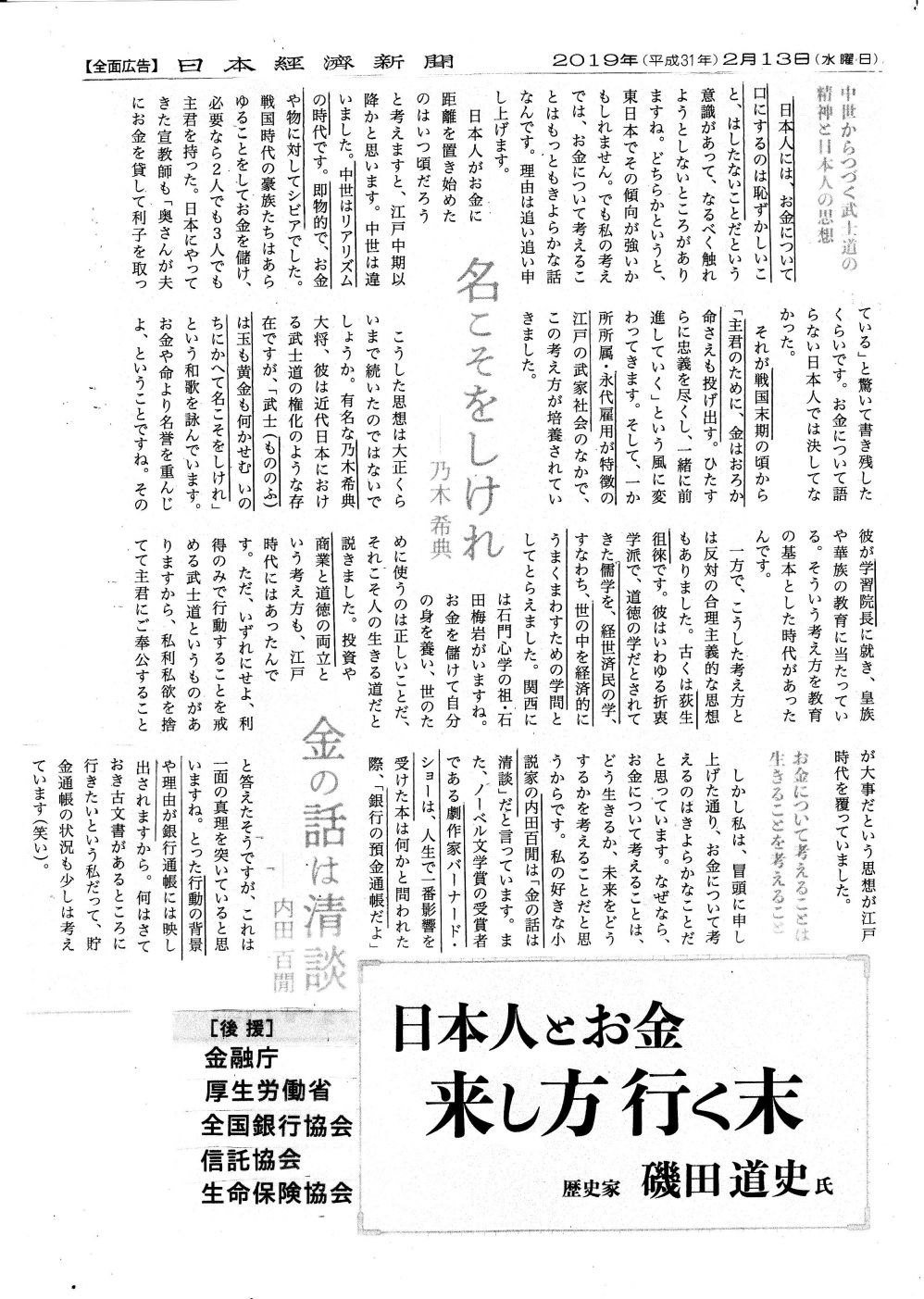 前略 連日のメール配信で恐縮です。 さて、2月13日は「NISAの日」だったそうで、これにちなみ、日経朝刊に金融庁・厚生労働省・全国銀行協会ほかの後援による「全面広告」がありましたので、他紙でも同様の広告が掲載され読了済みとは思いますが、念の為、ここもと添付送信します。 記事の内容は、国際日本文化センター磯田 道史准教授(イソダ ミチフミ:昭45生~、慶大文卒・院博了)による「日本人とお金 来し方行く末」と題する話で、中世や江戸時代の日本人の「お金」に対する考え方が取り上げられており、また、荻生徂徠が儒学を「経世済民の学、世の中を経済的にうまくまわすための学問」と捉えていたこと、などが紹介されています。 なお、歴史家 磯田氏は昨年の「明治150年」を記念し、今上天皇・皇后へご進講された由。以上、閑話休題まで。 草々 PDF⇒JPG変換はTracker Software PDFXCview.exeによる。☆・☆<めいてい君の追加>1.PDFからJPGへの変換 (PDFXCviewによる)2.NISA=Nippon Individual Savings Account 2/13が「NISA」の日 (11/23は「いい兄さんの日」 11/22は「いい夫婦の日」) 金融庁から3.めいてい君の感じ方・割引率・利子率 僅かのお金を将来に託す・・・将来を「希望に託す」という意味で「貯金」をするのが「節倹」というものではないだろうか。(人的投資を行った米百俵の精神にも繋がる。) 今の世の中は、ゼロ金利に近い(=将来を現在に割引すると0に近い)⇒将来価値がない世の中!?になったのでは・・・(本当は、手数料を引けばマイナス金利ダ!) 「NISA」が非課税口座というが、「0%」に近い金利ではたかが知れている。 預金は・・・ お国のための捨て金となりつつある。 荻生徂徠のように節倹をして身の将来を託すことを美徳とするなら⇒預金金利を「0%」にすべきではなかろう! 財務省は「節倹の意味」を吟味し、貧しい庶民の預金金利をいくらか上げるべきであろう。 消費増税で、さらに国民から取り上げて、「選挙権のない大企業」の税率を下げる、その魂胆は如何か?「選挙権は企業には与えていないから」、いずれは選挙で「凶!」と出るに決まっている。 頭を冷やして与党も野党も出直すべきである。 呆けの言うことだから、当てにはならないが・・・マックス・ヴェーバーの「プロテスタンティズムの倫理と資本主義の精神」を読み返してもらいたい。☆