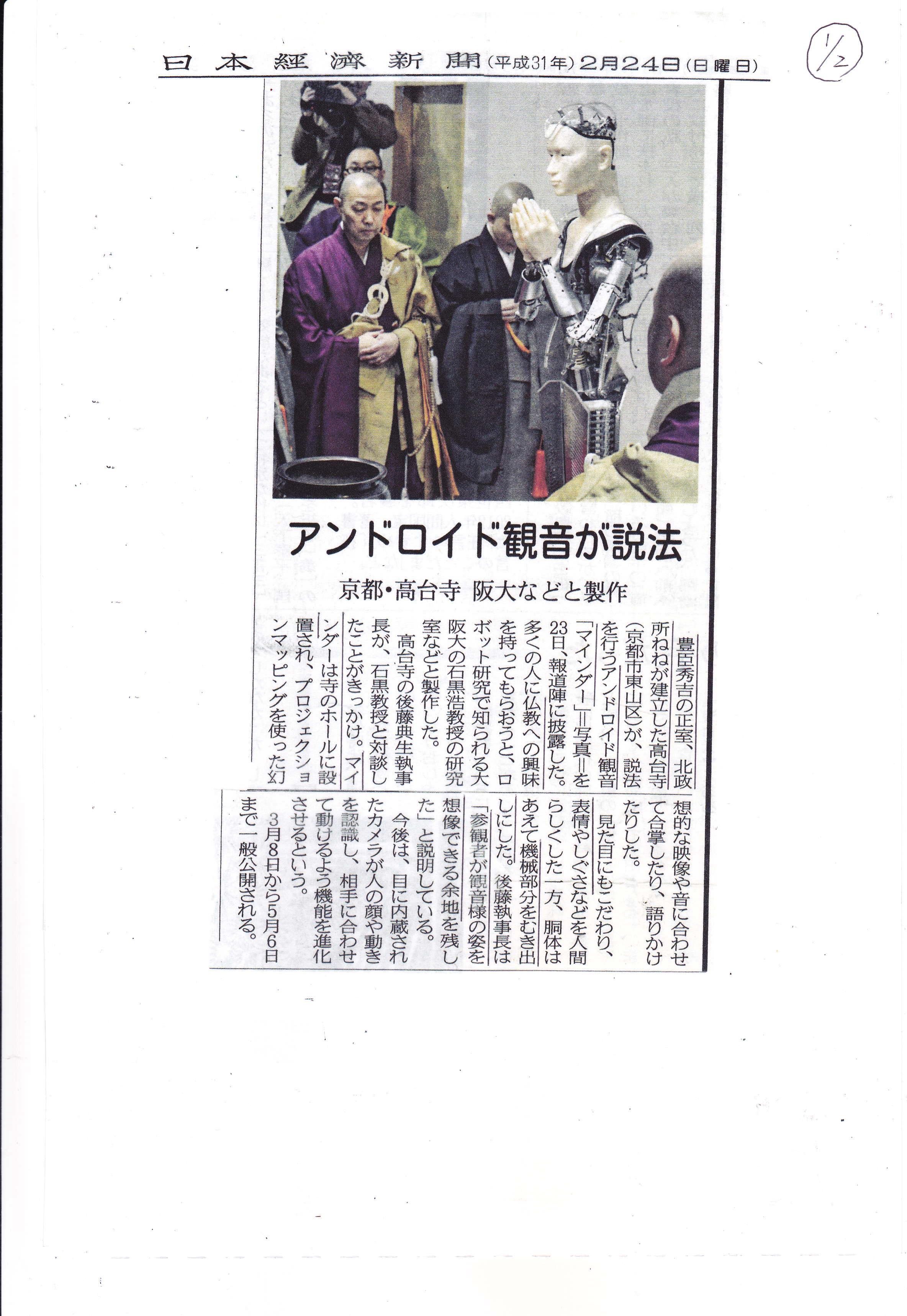 ☆賢明なる諸兄へ from Mr.Tsunami 前略 日経朝刊に、京都市東山区「高台寺」に設置された説法する「アンドロイド観音」が紹介されていましたので、既に読了済みとは思いますが、念の為、ここもと添付送信します。 高台寺の執事長によると、アンドロイド観音様は、参観者が「観音様」の姿を想像できる余地を残すため、敢えて機械部分をむき出しにしている、とか…。 参観者がビックリされないことを祈ります。 また、同紙「文化欄」には大蔵流狂言方 山本 東次郎が 「老いに挑む」と題する一文を掲載していますので、併せて、添付しました。 山本師は70歳を過ぎてから、慢性硬膜下血腫・前立腺癌・腰部脊柱管狭窄症・内頚動脈狭窄症などで4回、手術を受けた由。 ひょっとして 日本の伝統芸能「能」の世界でも、熟達の能楽師に取って代わり、いずれは病気知らずのアンドロイドが「能面」と「能衣装」を付けて舞うのではなかろうか…、と夢想してしまいます。 以上、閑話休題まで。 草々 ☆・☆<めいてい君の追加>当方は、日本の古典には素人なので言葉の使い方にはご勘弁を願います。1.高台寺「アンドロイド観音」・・・共同通信https://www.47news.jp/video/kyodo-video/3302063.html2.「老いに挑む」:山本 東次郎氏 日本経済新聞 2019/2/24付 朝刊3.狂言方<https://db2.the-noh.com/jdic/2008/05/post_15.html>☆<参考>http://www.tessen.org/dictionary/program☆