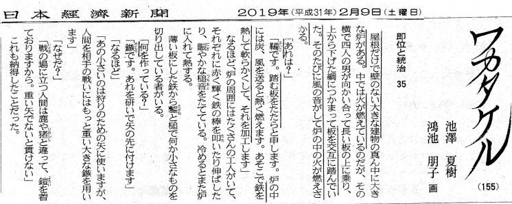 ☆賢明なる諸兄へ from Mr.Tsunami 前略 池澤 夏樹氏は日経朝刊に「ワカタケル」と題する小説を連載中ですが、場面は、倭(ヤマト)の新たな大王(オホキミ)となったワカタケルが大伴・物部など有力豪族に職務を割り振り、朝倉宮での本格統治を開始して以降を描写しています。 ワカタケルは、先ず、蚕の繭から絹をとる工房の視察を皮切りに、たたらを踏んで風をおくり鞴(フイゴ)で鉄を溶融する鍛冶場、そして、陵墓に備える埴輪を作る工房などを順次見学する場面を描いており、朝鮮半島から伝来したこれらの諸技術が国内で生かされている様子が順に描かれています。 読了済みと思いますが、期近の新聞記事を、念の為、ここもと添付送信します。以上、余談まで。 草々☆・☆<めいてい君の追加>1.踏鞴製鉄:WIKIPEDIAたたら製鉄(たたらせいてつ、英:Tatara)とは、日本において古代から近世にかけて発展した製鉄法で、炉に空気を送り込むのに使われる鞴(ふいご)が「たたら」と呼ばれていたために付けられた名称。砂鉄や鉄鉱石を粘土製の炉で木炭を用いて比較的低温で還元し、純度の高い鉄を生産できることを特徴とする。近代の初期まで日本の国内鉄生産のほぼすべてを担った。この記事では基本的に、初出時を除いて「鉧」を「ケラ」、「銑」を「ズク」、「鞴」を「フイゴ」、「鉄滓」を「ノロ」とそれぞれ表記する。2.土師氏(はじうじ、はじし)は、「土師」を氏の名とする氏族。天穂日命の末裔と伝わる野見宿禰が殉死者の代用品である埴輪を発明し、第11代天皇である垂仁天皇から「土師職(はじつかさ)」を、曾孫の身臣は仁徳天皇より改めて土師連姓を与えられたと言われている。<土師家系図:WIKIPEDIA>☆