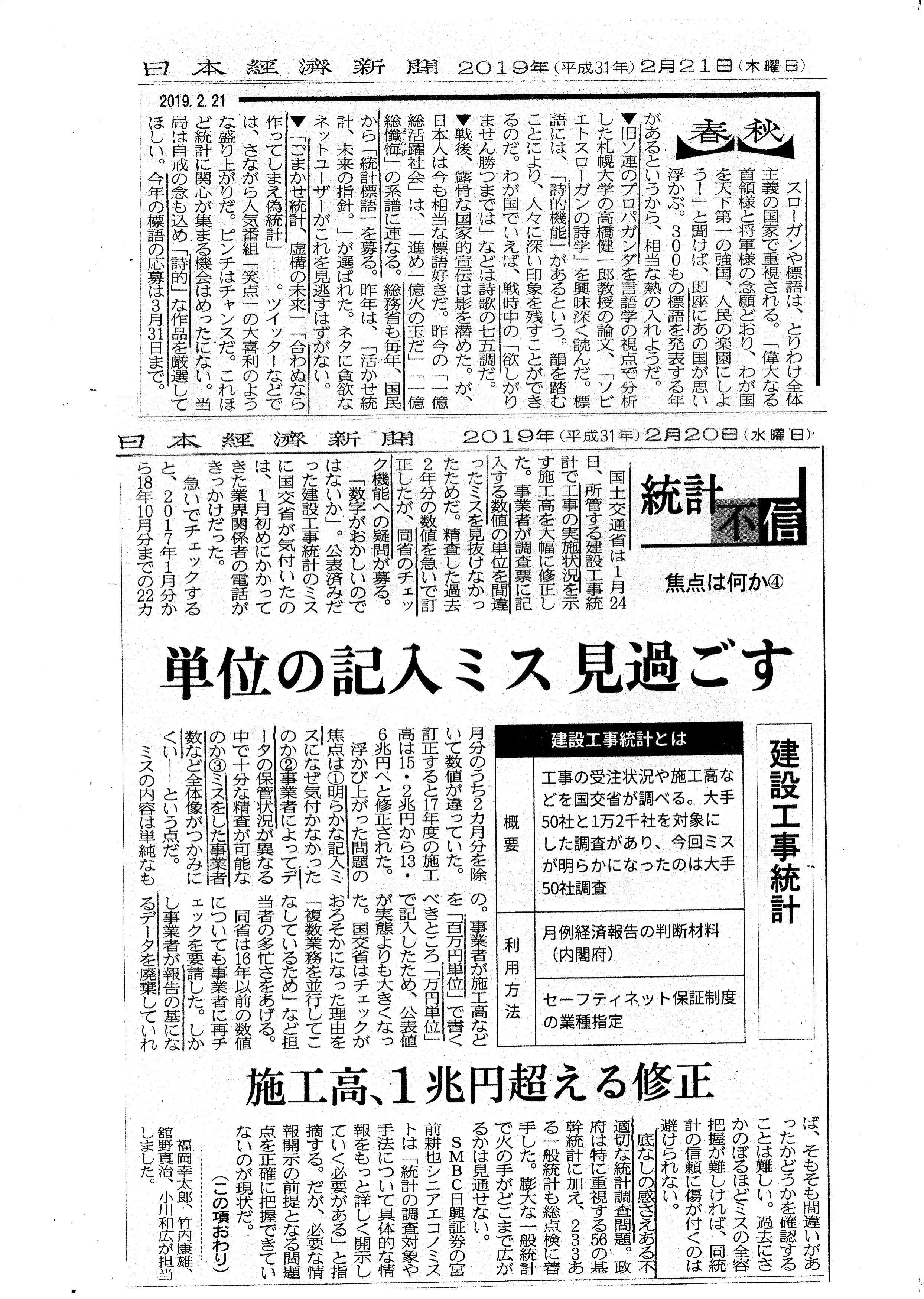 ☆賢明なる諸兄へ from Mr.Tsunami 前略 日経朝刊コラム「統計不信」が4回連載されていましたが、日経朝刊コラム「春秋」では、総務省の「統計標語」の公募について触れていましたので、既に読了済みとは思いますが、念の為、 ここもと添付送信します。 コラムでは、「ごまかせ統計、虚構の未来」とか、「合わぬなら、作ってしまえ偽統計」などツイッター投稿での痛烈な標語が並べられていましたが、小生が新入社員として現場に配属されたころ、最初に教育されたことは、「事務処理のミスは、ゴマカシと同じこと。ミスをしないよう、常に事後のチェックを怠らぬこと」ということでした。 個人がパソコン等でデータを入力できるようになっている、と思われる現代、はたして職場教育がどのようになされているのか、心配し過ぎでしょうか?…。以上、閑話休題まで。 草々☆・☆<めいてい君の追加> 1.「春秋」の拡大 2.「統計不信」の拡大3.ある経営者に聞いた話 「自分は、統計の資料を提出するように 上部団体から要請されているが、 そのままの数字を出したことはない。 発表された数字から自分の出したサンプル数字を 調整して、本物の数字?を弾いている。 自分だけが本当の数字を知っているのだよ!」 サンプルを出す会社がこれでは、 誤差が積もるかもしれない。 どこかにチェックできる機関が必要ではないだろうか。 少なくても、統計操作で異常値を 刎ねる工夫が必要かもしれない。 または、頻繁に異常値を提出する会社は サンプルから除外するなどが必要かも・・・ 「作為」と「ミス」の交じった統計原資料から 如何にして母集団に近づくのか・・・難しい話である。 「性善説」で逃げるか、「性悪説」で信用しないか、 国会で議論する以前の問題もあるのでは・・・☆