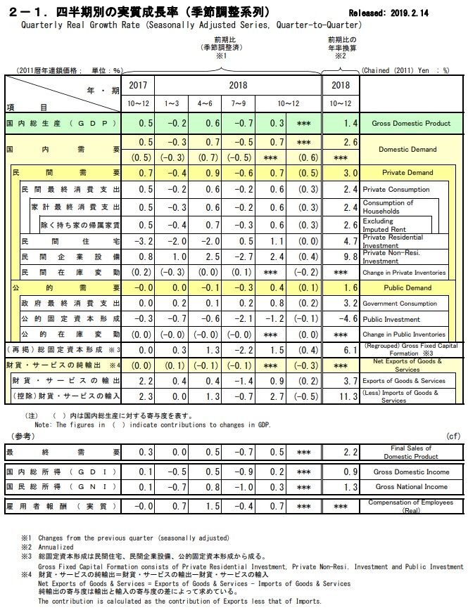 ☆ 内閣府から2018年10~12月期の実質GDP成長率について、QE(四半期速報Quarterly Estimation)のQE値(四半期速報値Quarterly Estimates)がQE(速報Quick Estimation)として公表された。 季節調整済み実質成長率は0.3%(年率換算1.4%)と前期7~9月期の▲0.7%から回復したが、4~6月期の0.6%,前年同月期の0.5%の伸びを下回った。 今10~12月期の0.3%の伸びの内容を見ると、国内要因の寄与度は0.6%の成長だが、海外要因寄与度が▲0.3%の減少。 需要項目別(実質GDPは年率534.3兆円 ⇒実数値は最下段の表)には、民間最終消費支出(同301.5兆円:56%)が前年同期の10~12月期から0.5%→▲0.2%→0.6%→▲0.2%→0.6%とジグザグの動きを示した。 特に、4~6月期は野菜、原油等の値上がりに加え、自動車、スマートフォンが伸び悩み、また、7~9月期は西日本豪雨、北海道地震の災害時の消費落ち込みの影響で不振であったが、雇用者報酬(賃金)の持ち直し、自動車売れ行きの好調などで回復気味。民間住宅(同15.4兆円:3%)は▲3.2%→▲2.0%→▲2.0%→0.5%→1.1%と一時のマイナス不調から回復中である。民間企業設備投資(同87.6兆円:16%)では、0.8%→1.0%→2.5%→▲2.7%→2.4%と前期災害時の落ち込みからはプラスに転じている。 公的需要は、政府最終消費支出(同107.9兆円:20%)では0.0%→0.2%→0.1%→0.2%→0.8%とプラスを推移だが、公的資本形成(同24.7兆円:5%)は▲0.3%→▲0.7%→▲0.6%→▲2.1%→▲1.2%とマイナスが大きく続く。 一方で、問題の海外需要は「プラス項目」の財貨・サービスの輸出(93.1兆円:17%)は2.2%→0.4%→0.4%→▲1.4%→0.9%と前期、災害時の出荷体制が旨く取れないために、大きく落ち込み、その回復力は中国経済の減速で芳しくはならず、「マイナス項目」の財貨・サービスの輸入(96.7兆円:18%)が、2.3%→0.0%→1.3%→▲0.7%→2.7%と、石油価格の上昇で増勢傾向にあり圧迫気味である。 四半期別名目GDP構成項目の成長率は下記である。 ここでは、各項目は図表を辿るとよい。 「年次別の実質成長率」も得られる。 2016年→2017年→2018年の実質成長率推移は、0.6%→1.9%→0.7%*で、(*実額533.9兆円⇒下の表を参照)内需要寄与度は0.0%→1.3%→0.7%外需要寄与度は0.6%→0.6%→▲0.0%である。2018暦年貿易統計:財務省 昨年までの輸出の牽引は薄れて、国内需要の力に依存している。 参考として、名目年次GDP成長率は0.9%→1.7%→0.6% デフレーターは0.3%→▲0.2%→▲0.1% 国内需要デフレーターは▲0.6%→0.4%→0.6%となっている。☆1.実数の季節調整済み 四半期年率の推移(単位:2011暦年連鎖価格、10億円)2.実質GDP実額推移: 単位10億円 2011暦年連鎖価格<内閣府経済社会総合研究所国民経済計算部から作成> ☆