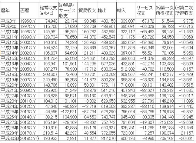 ☆ 2月8日に財務省から「国際収支状況」として国際収支総括表が公表された。 平成30暦年(2018年)は速報値(P)であり、単位は「億円」。<財務省 国際収支状況 平成8年~平成30年> 昨年の経常収支(海外とのモノ・サービス取引や投資収益など)は、19兆932億円と黒字であるが、平成28~29年の21兆円台ベースから約2~3兆円ほど黒字幅は減少した。 構成項目でみると、モノの貿易収支は、輸出が過去最高の水準(約81.2兆円)を示したが、漸増する輸入石油価格などの増嵩で輸入も過去2番目の80兆円規模となったため、昨年の4兆9554億円から1兆1877億円に減少し、マイナスのサービス収支▲8986憶円と合わせて、「貿易・サービス収支」は昨年の4兆2297億円から僅かに2891億円となった。 サービス収支は、10年前には▲4兆円レベルの赤字であったが▲9千億円規模に赤字は縮小しており、外国人観光客の訪問数が増えつつあるのがその一因でもある。 他方で、稼ぎ頭の「第一次所得収支(=本邦企業が投資した海外の子会社からの配当金など)」は20兆円と過去2番目の高い水準を維持できている。 第二次所得収支は▲2兆円レベルが続いている。☆<参考=用語の説明:財務省>経常収支 貿易・サービス収支、第一次所得収支、 第二次所得収支の合計。 金融収支に計上される取引以外の、 居住者・非居住者間で債権・債務の移動を 伴う全ての取引の収支状況を示す。貿易・サービス収支 貿易収支及びサービス収支の合計。 実体取引に伴う収支状況を示す。貿易収支 財貨(物)の輸出入の収支を示す。 国内居住者と外国人(非居住者)との間のモノ (財貨)の取引(輸出入)を計上する。サービス収支 サービス取引の収支を示す。 (サービス収支の主な項目) 輸送:国際貨物、旅客運賃の受取・支払 旅行:訪日外国人旅行者・日本人海外旅行者の宿泊費、 飲食費等の受取・支払 金融:証券売買等に係る手数料等の受取・支払 知的財産権等使用料:特許権、著作権等の使用料の 受取・支払第一次所得収支 対外金融債権・債務から生じる利子・配当金等の 収支状況を示す。 (第一次所得収支の主な項目) 直接投資収益:親会社と子会社との間の配当金・利子等の 受取・支払 証券投資収益:株式配当金及び債券利子の受取・支払 その他投資収益:貸付・借入、預金等に係る 利子の受取・支払第二次所得収支 居住者と非居住者との間の対価を伴わない資産の提供に係る 収支状況を示す。 官民の無償資金協力、寄付、贈与の受払等を計上する。収(+)支(▲)、受(+)払(▲)☆