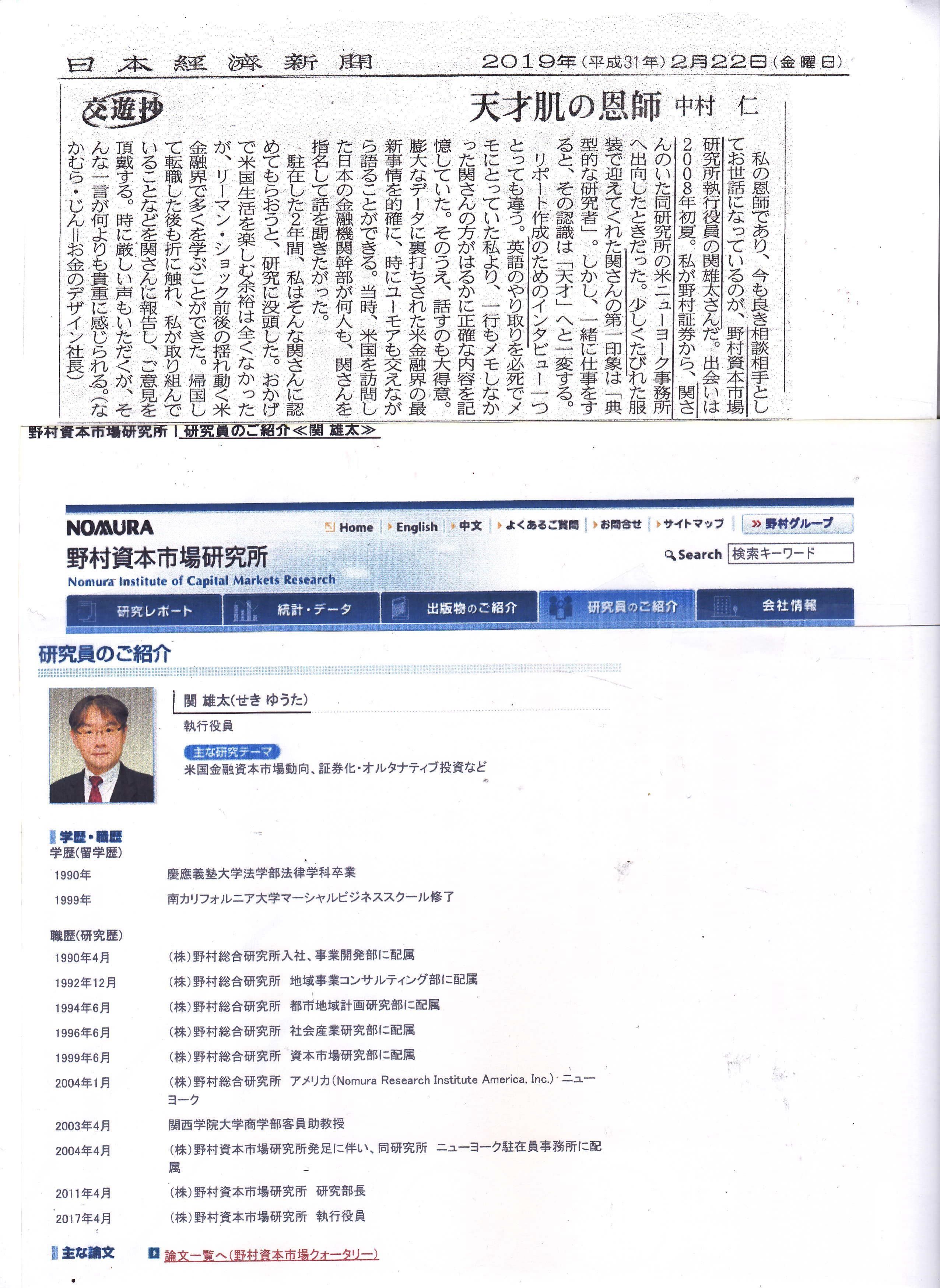 ☆賢明なる諸兄へ Mr.Tsunami前略 日経朝刊コラム「交遊抄」に、(企業家コンサルタント:「中村 仁氏」が出向した)野村資本市場研究所NY事務所での現執行役員「関 雄太氏」との交遊抄が触れられていますので、(関 雄太氏のお知り合いの方々に)既に読了済みとは思いますが、 ここもと、添付送信します。 草々☆・☆<めいてい君の追記>・当該「交遊抄」の拡大・関 雄太氏のプロフィールの拡大<http://www.nicmr.com/nicmr/researchers/rs_seki.html>・中村 仁氏のプロフィール(後略)<http://www.braveentrepreneur.jp/profile/>☆