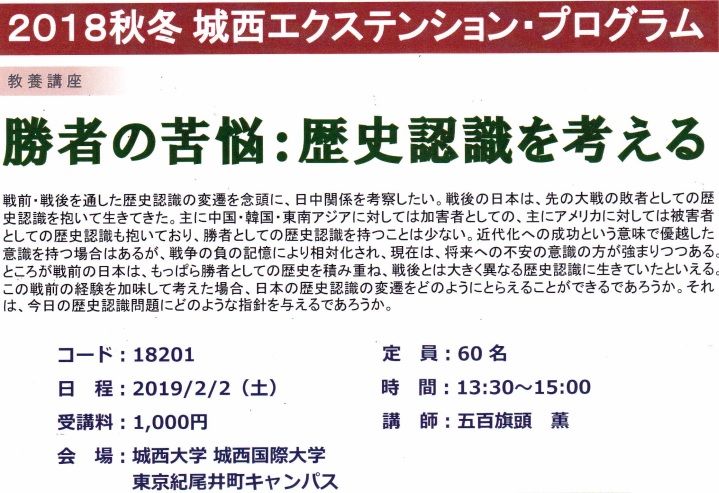 ☆賢明なる諸兄へ from Mr.Tsunami前略 日経朝刊「私の履歴書」に、我々とほぼ同世代の「五百旗頭(いおきべ)真(または 眞)氏(昭18年12月生~、昭和42年京都大学法学部卆)」が連載をはじめ、今朝の第4回では、父・五百旗頭 眞治郎氏が紹介されていました。 手元の「如水会々員名簿」によると、眞治郎氏は大正8年東京高等「専攻部」卒業となっています。 蛇足ですが、先日、五百旗頭 真氏のご子息で、東京大学大学院政治学研究科の五百旗頭 薫教授(昭49年生~、平成8年東京大学法学部卆)の、「勝者の苦悩:歴史認識を考える」と題する講演会が別添のように開催されましたので参加してきました。 講演内容は、1853年、ペリー艦隊の浦賀入港以降約150年にわたる日本の政治・経済・軍事・社会など、諸事情の歴史的変遷で、戦争の勝者という切り口からの整理が大変役立ちました。 以上、余談まで。 草々☆・☆<めいてい君の追加>WIKIPEDIAから五百旗頭 薫 氏 家族・姻戚祖父・眞治郎氏:父:眞氏本人:薫氏☆