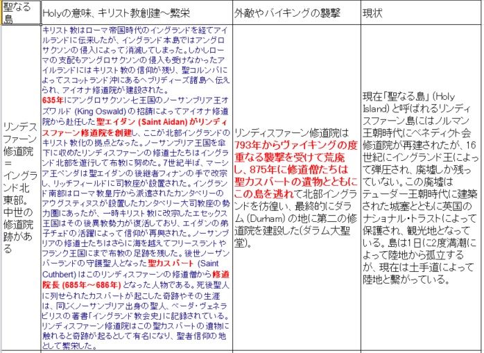 ★ 先日は、イングランド北方の「ホリーアイランド」(=聖なる島)をエディン薔薇さんの寄稿文で取り上げた。 しかし、その際には、小生の不勉強と、現在におけるキリスト教の修道院が廃墟と化しているために、嘗て置かれた「リンデスファーン修道院」の名前から「リンデスファーン島」である~として 最初は 取り上げて居ない。 キリスト教も~ローマ・カトリックから~~~英国やドイツなどでは「免罪符を購入」するだけで犯した過去の罪を免れるという教義から離れるに至り、プロテスタント、福音派教会などに分派している。 カトリック教会などは、大航海時代にコンキスタドールとして南米大陸を征服し財宝を奪い取ることを認めたり、アフリカ大陸からの奴隷を運ぶ商人が暗躍したり、米大陸では銃によるインディアン征服を行うなどキリスト教も「負の遺産」を抱えている。 ・・・・・ 聖なるものへの脅威だけが人類への悪ではないように思えるのは~どうしてだろうか? 例えば~~~ 「米国ファースト」はどんなものであろう。 ** この場合の「米国=美国」とは何を指すのか ? 米国→美国→白人移民の国→銃で征服の国 →白人至上主義=”トランプ”に興じる国???★ 今回は改めて、「聖なる島」なる英国の近くにある島について外敵やバイキングによる脅威を取り上げる。 原資料はWIKIPEDIAから引用する。********見辛い方は「CTRL」+「+」を数回押して下さい。元に戻すには「CTRL」+「0」を押して下さい。******** ウエールズにあるホリー島がダブりましたが、最後尾にあるのを採用ください。 さらに、キリスト教とバイキングの衝突は、 カール大帝の戴冠というフランク王国とVIKINGとの軋轢が契機と言うから~WIKIPEDIAで~少し~復習してみる。 ~一夜漬けでは~この程度で申し訳ない~~~★
