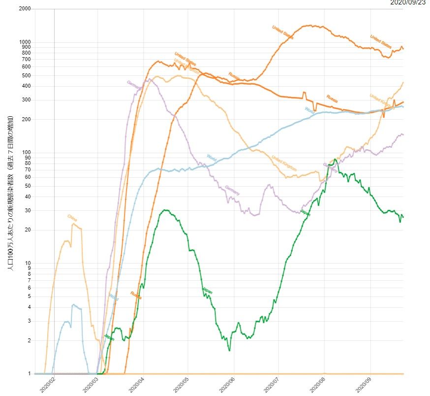 ★ 見っともないことが世界の首脳が集まる国連会議場で、起こっている。 各国からの代表者1名の出席者に向けて演説者のVIDEOメッセージが長時間流れている。 世界の名立たる代表者は米国のトランプ大統領と中国の習主席である。 トランプ大統領は、当初は「COVID-19」を軽視していたが、米国感染者数が世界のトップ(7.1百万人)に居座り続けると~~慌てて、感染の拡大原因を中国のせいに追及する。 中国が、感染の数から無発症病原体保持者を感染者数から除外(be exempt from)したことに、非科学的ながら~米国も追随しようとしていた。 米国は、中国が感染者数では、世界の発表とは異なる基準で少なく感染者を発表しているのを、WHOとの癒着?と見ているのかもしれない。 また、中国が感染防止のために国内間移動封鎖を行う反面で、海外渡航には基準が緩いことで、海外諸国への感染拡大を行ったと決めつけている。 確かに、強権で国民の発言を抑え込もうとする中国政府の姿勢と、感染者数の突然の抑え込み(=感染者数は8万5千人で頭打ち:突如、新規感染者はほぼ→0)は附合する。★ 人口百万人当たりの新規感染者数(過去7日間の増加):対数目盛 世界 中国 独 日本 露 英国 米国資料出所:https://web.sapmed.ac.jp/canmol/coronavirus/japan.html?d=2&y=0★ 商業主義に塗れたIOCは延期した東京オリンピックを~世界が「深刻な」感染状況レベルにも拘らず「警戒的な楽観レベルに」” with cautious optimism ” ~落としてまで~~~開催しようとしている。 安全なワクチン開発さえ、露西亜を除いて~~~欧米のメーカー段階でストップ状態であるにも拘わらず、最早、日にちが迫っただけで、「COVID-19」最中の危機を忘れて開催一色に染まりそうな勢いである。 第三次世界大戦のラッパもこのようなものかもしれない。 日本でも、明日にでも~オリンピック開催ラッパが” with cautious optimism ” の言葉とともに吹き荒れるかもしれない。 ただ、日本にはFactor-Xi(i=1,2,3,..)なる特殊なBCG接種による抗体などもあり、ワクチンが開発されつつある。 これだけで、日本人以外の世界の人間に有効かは全くのオプティミズムではないだろうか。 慌てるな! ではあるまいか。★<関連記事>読売新聞朝刊 3面 総合「SCRAP記事」*******画面を拡大する場合は「CTRL」+「+」を数回押す、元に戻すには「CTRL」+「0」を押して下さい。*******資料出所:https://pageviewer.yomiuri.co.jp/shimen/yp#sec_page_paper_detail★ 世界の感染者数 32百万人時代へ。 日本時間 2020/9/24 17:10日本のPCR検査率:1.5%・・・お粗末! 米国 30.3%資料出所:https://www.worldometers.info/coronavirus/★