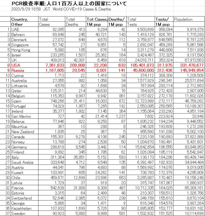 我が国は、不思議にもコロナウイルスの感染から~世界がその感染力に怯え慄いているにもかかわらず~比較的少ない感染と死者で済んでいる。 9月29日でhttps://www.worldometers.info/coronavirus/により観察した数字を、人口1百万人以上の国家を抽出してPCR検査率(人口百万人以上の国家)でみる。 人口百万人当たりのPCR検査数字(人)であるから、1百万人が「100%」に相当する。 「Tests/1M pop」をご覧ください。 例=PCR検査率 1位の「UAE」は 95.8% である。 ↓ これを見ると、PCR検査を行っている人口1百万人以上の国々141ヶ国の小計は総人口の 約95%を占めるが、そこでは単純平均で 8.7% のPCR検査実施率である。 日本は、141ヶ国のうちの 103位であり、 わずか 1.5% に過ぎない。 菅新首相~恥ずかしくありませんか! 何度でも言います。 主な国家については、赤字で示したが、人口1百万人当たりの感染者人数(=「Total Cases/1M pop」)同死者人数(=「Deaths/1M pop」)も掲示してある。 絶対量の感染者数は、一位の米国が 736万人であるが、インドは人口が多く、ブラジルの 475万人を抜き、615万人で第二位にあり、今年中には米国を追い越しそうな勢い。 素手でご飯を掴む~密な生活様式は危険ではないか。・・・・・・・・・・・ 賢明なる諸兄の判断に委ねます。 ・・・・・・・・・・・<我が国についての ”推理” > 相次ぐ有名人の自殺は、もしかして~~~超低率な~~~PCR検査との因果関係などではあるまいか。 単なる風邪なのか、コロナウイルス感染症か・・・判らぬままに悩んでいたら~~~気の毒であろう。 医療体制が現在のままなら~孤独な俳優たちの生活の場が失われるのでは? 強制的にでも~全員がPCR検査を~簡単に受けられる体制が保険適用でできないものか? そして、たとえ陽性者と判定されても~簡単に入院でき、過去の給与が一定期間は保障される体制が国家として図られなければ国民は安心できないのではないだろうか。 特に、演劇者(歌舞伎役者・俳優・女優)などが~PCR検査では~苦痛に感じるのではないだろうか。 PCR検査率が世界的に低いこと、フリーな演劇者などの所得が保障されにくい点などコロナ禍では日本独特の問題点が浮き出ている。 コロナの感染者がファクターXで少ないからと日本政府は浮かれてばかりいられないのでは・・・ フリーな演劇者は、過去の高額収入により、非常識な生活を享受してきたが、コロナ禍で状況は一変しているはずである。 かれらは、演劇が出来なくては~食っていけないのに~政府や自治体は彼らの生活の保障は何も見ていない。 議員は~閉会中でも給与を貰えるのに~演劇者は報酬もなく~~~逆境にあり~高い家賃を支払う羽目に追いやられている。 これでは~自殺者がでるのは当たり前かもしれない。 同じ番組に出演していた仲だから~~~などという生易しいものではなく~~~生活の糧を失うという極限状態を推察願いたい。★ ”浮世の状況”の分からぬ~~~ 呆けの独り言である。★