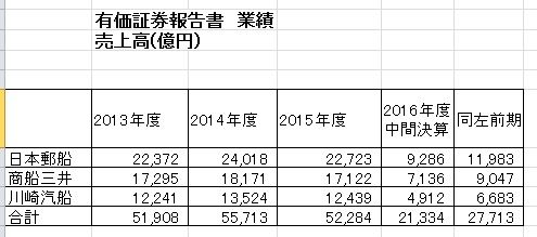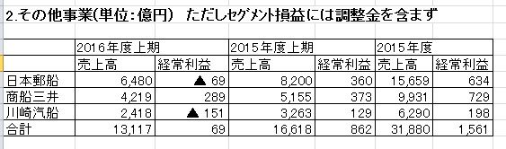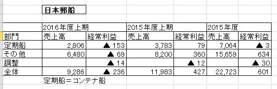 各社の セグメント別(部門別)業績 を、コンテナ部門(=日本郵船は定期船部門)