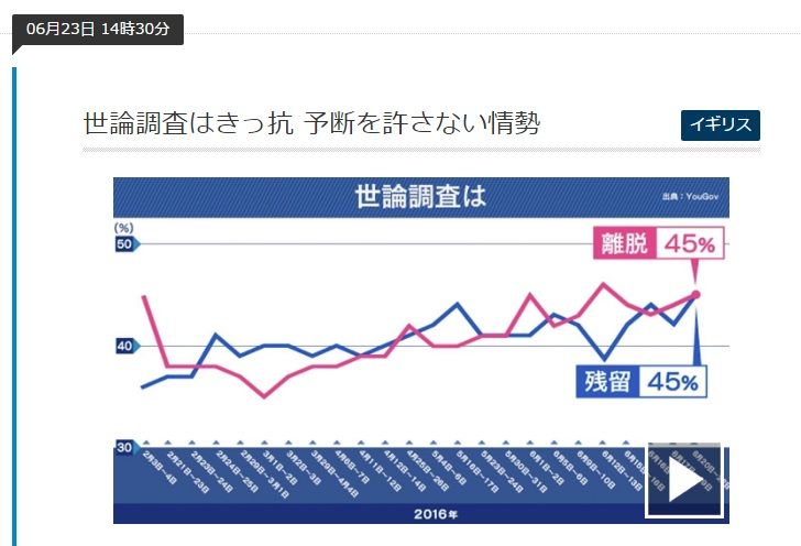 < BREXIT国民投票前の「EU離脱 or 残留」 世論調査:NHK Newsから