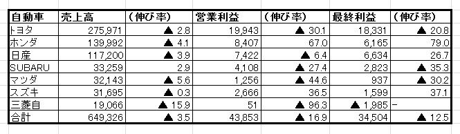 最終利益をみると、自動車業界だけ減益であるが、その他は増益となっている。