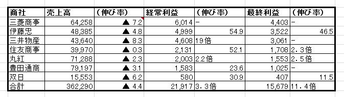 丸紅(623)、住友商事(745)も大幅に改善している。