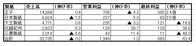 日本製紙、北越紀州製紙、三菱製紙は増益、全体は横ばいである。