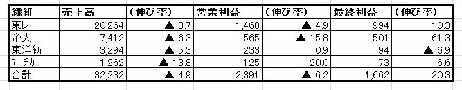 営業利益ベースでは、東レ、帝人が減益、ユニチカが増益、