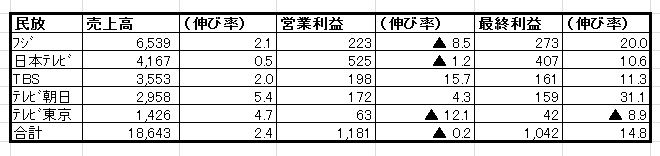 営業利益ベースでは、TBS,テレビ朝日は増益、フジ、テレビ東京は