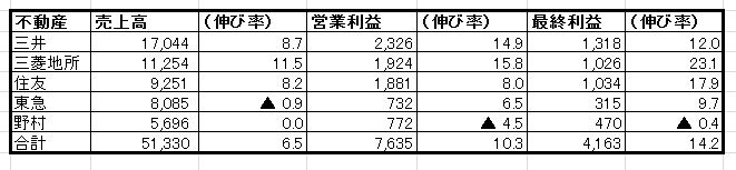 最終利益は全体として14.2%増加だが、野村不動産は横ばい