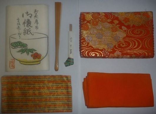 < 茶道の持ち物・・・1.扇子、2.帛紗、3.古帛紗、4.懐紙、5.楊枝、6.楊枝入れ、7.帛紗ばさみ。