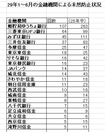 そのなかで、2017年上期に5回以上の「未然防止協力金融機関」を下記に掲載した。