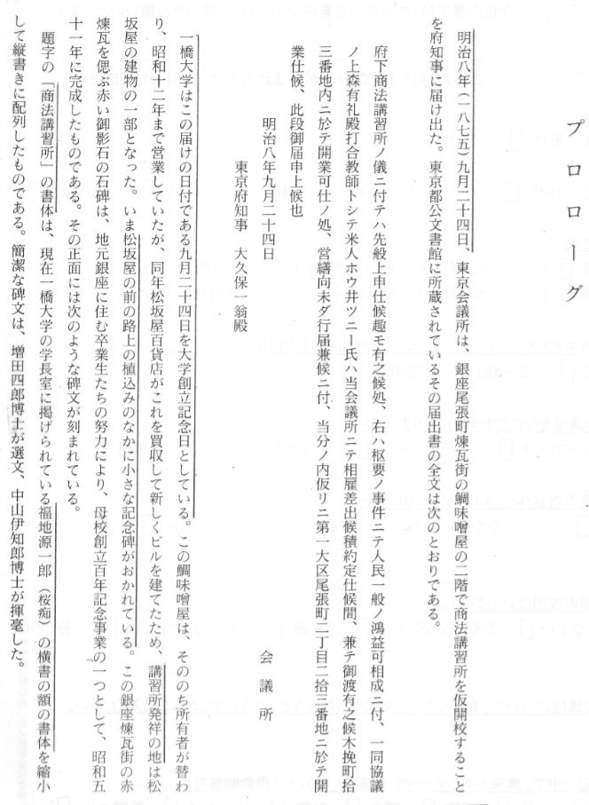 現在、銀座に「 商法講習所発祥の地 」の碑が建立されていますが、