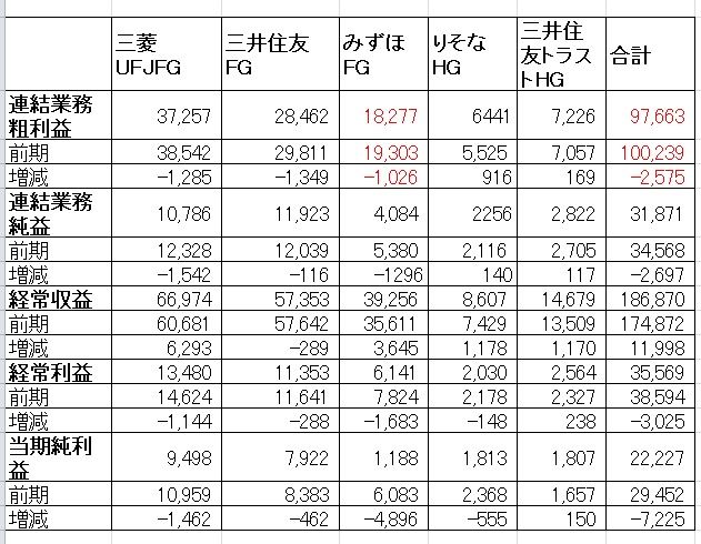 ・大手銀行5FG・HG連結決算