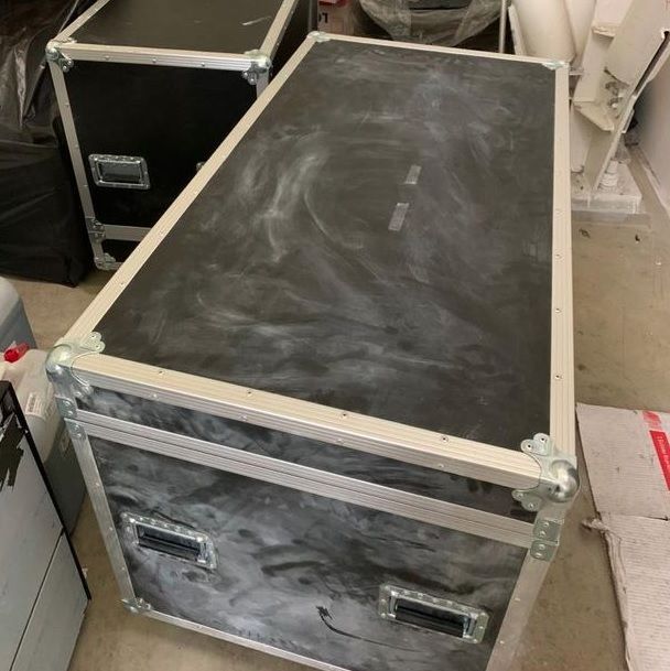 空港内で、「音響機材用の黒箱2個X」の一つ