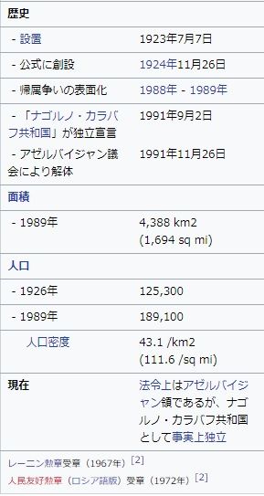 戦闘再熱。停戦合意後、最大規模に。アルメニア側は兵士202人死亡。アゼルバイジャン側の兵士死亡者は未公表、民間人24人が死亡。アゼルバイジャン軍は約13万人VSアルメニア軍6.5万人でアゼルバイジャン側が優位にあるが、更に、トルコ軍が戦闘機で支援している模様。 |