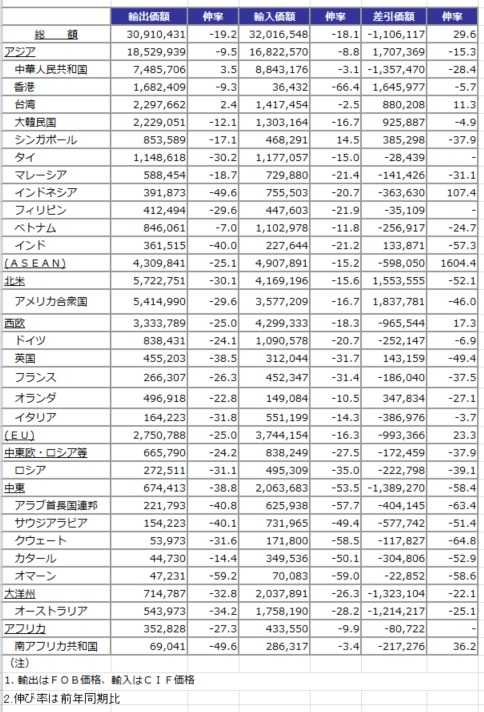 単位は百万円、輸出はFOB価格、輸入はCIF価格
