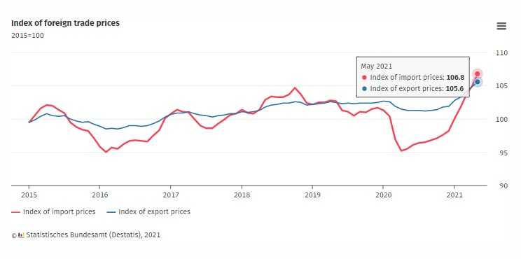 2021年4月から5月の輸入物価指数は前月比では +1.7%。