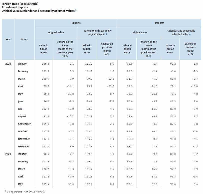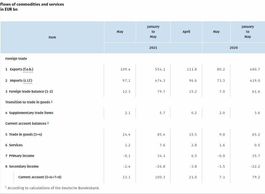 外国貿易収支は2021年5月に +123億€であった。